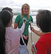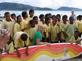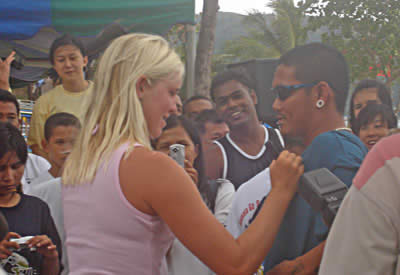 Phuket was honoured to have Bethany Hamilton visit in her quest to help and support children living in poverty. Her trip was organised by TAT, World Vision and Rip Curl and she came to Patong Beach on Sunday 28th of August 2005 to run a surf clinic for the local up and coming Thai surfers.Bethany suffered a shark attack in 2003 where she lost her arm, but faught against the odds to become an ambassador for surfing and now participates in fundraising activities around the world.