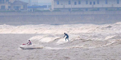 Its legally forbidden to take any activity in the river during the bore, especially after 12 people were killed last August,2nd watching the bore at night near Hangzhou. In the last 20 years, the bore has taken about 100 lives, victims being mostly unaware spectators getting caught on the banks, not able to swim. The law got reinforced and its no surprise that the police eventually caught the surfers. Following a cover article by Wang Xinke in the Hangzhou Youth Times stating Foreigners break the law and a surfing world record, situation changed when Chinese Authorities started to smell the economical potential of creating a possible surfing show on the river. Law has not changed yet but when surfers got wet again, many helped them to catch up with the bore hitching rides along the riverbanks!