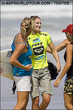 Reigning Roxy Pro champ Stephanie Gilmore (AUS) and rookie Silvana Lima (BRA), who were responsible for taking out top seeds in Georgeson and Mulanovich, were both eliminated in their quarterfinal heats. Also failing to advance from the quarters were last year’s runner-up Megan Abubo (HAW) and local surfer Trudy Todd (AUS).